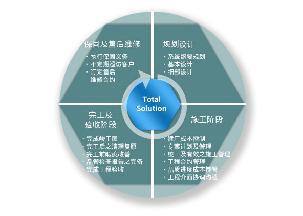 擎邦公司整厂统包方案(Turnkey)为客户提供单一来源的设计、规划、细部设计、施工和维修等专业服务,在此专业服务的范畴之下,提供业主建厂预算评估与不同方案之可行性评估及建议,以协助业主在有限之预算及工期内有效率地达成建厂专案计划。