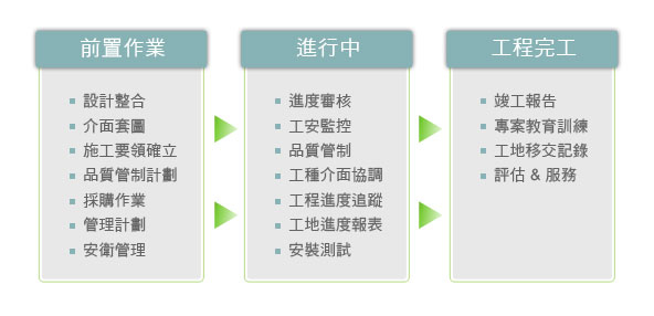 以下的執行概要即說明了統包工程相關前期作業、工程執行及完工等重要結點: